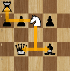 (In this situation, notice that one of the knights may be protected (by the rook, or, if not yet at the edge of the board, by the other knight); but one major piece of black’s here is guaranteed to fall unprotected.)